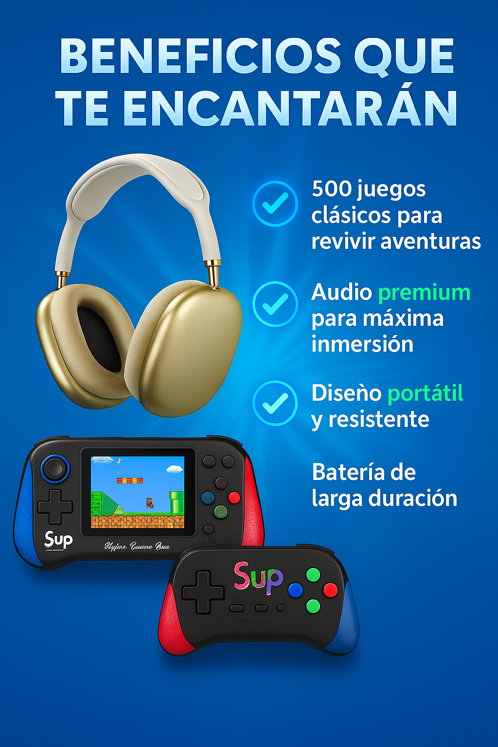 Con más de 400 juegos clásicos, sonido premium, batería duradera y un diseño resistente y moderno, convierte cualquier lugar en tu zona gamer personal.