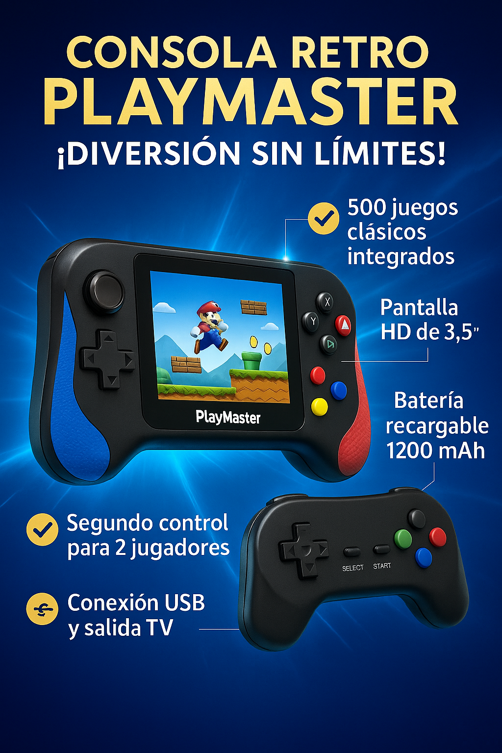 El PlayMaster Combo te permite disfrutar más de 400 juegos clásicos integrados, desde aventuras legendarias hasta desafíos arcade. Su diseño compacto y ligero lo hace perfecto para usar en casa, en el bus o durante tus descansos.